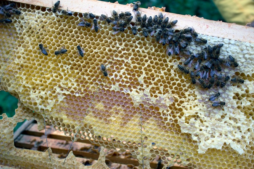 Bees robbing honey Published June 17, 2012 at 2976 × 1984 in A very important message from the bee inspectors for June The bees had started taking the honey from the comb in the top box to move into the bottom box. Notice the large holes in the wax comb at the bottom of the frame – our bees also tend to rob wax from frames to use in other parts of the hive.