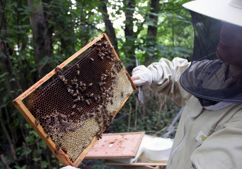 Emily inspecting Published July 28, 2012 at 1621 × 1134 in Olympic Queens! Emily shows our bees to the beginners. We noticed the raised dome cappings of drone brood in the centre of frames rather than around the edges.