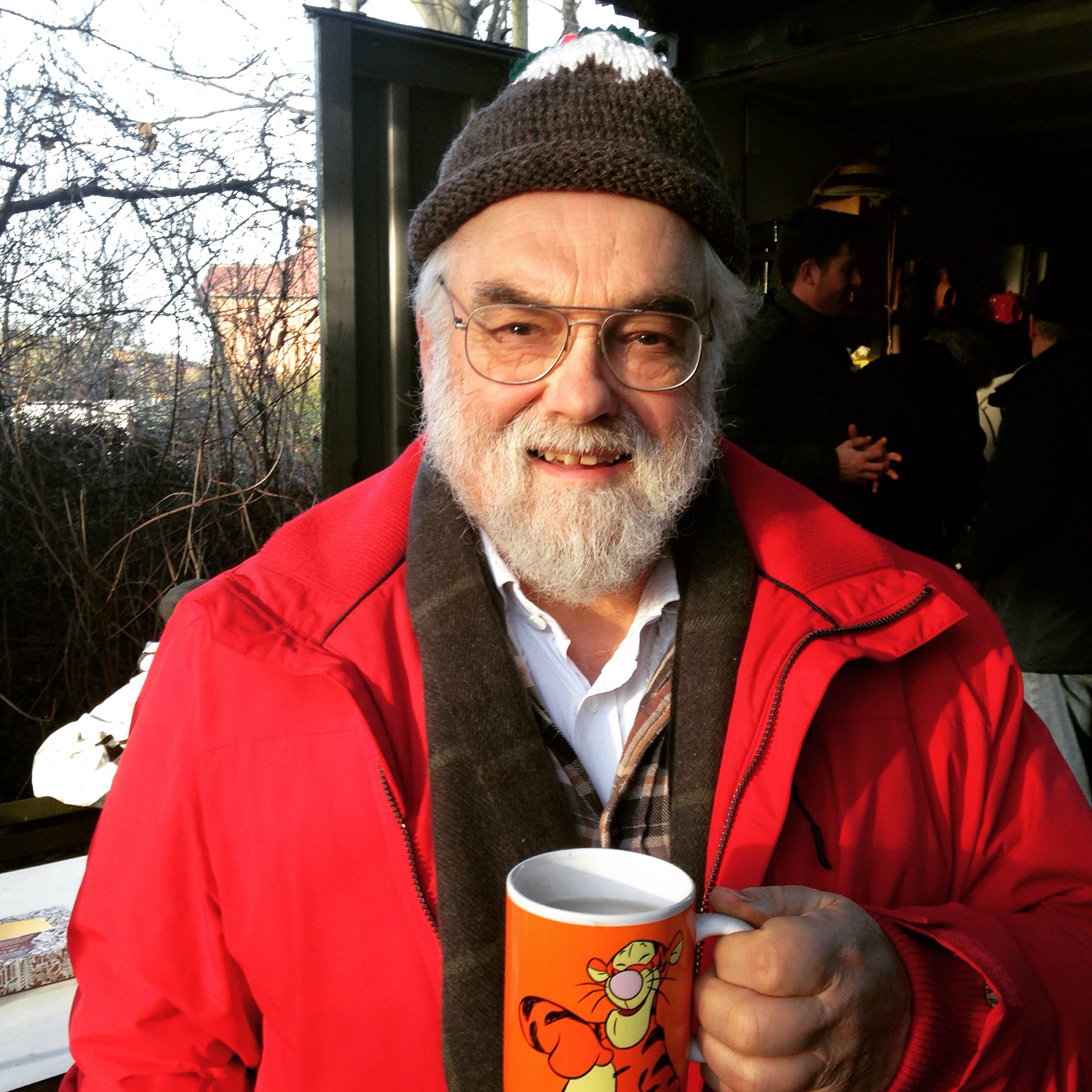 John Chapple looking cosy in a Christmas pudding hat and a tea-filled Tigger mug.