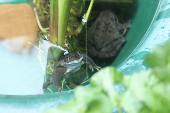 The middle part of our garden is long and narrow with an ivy hedge to the right and bushes of cotoneaster, jasmine and choisya to the left. I’ve resigned myself to the fact that few flowers will grow in the shady, walled bed beside the ivy where even foxgloves and bluebells struggle. This part of the garden has become a haven for frogs and thirsty birds and insects with a selection of frog ponds and shallow baths. I’ve also half buried broken flower pots and crockery in the soil to make shelters for weary creatures to rest. The decking at the front of the garden has a flowerbed that sticks out further, and in spring and summer it gets enough sunlight in the morning to sustain the myrtle tree with flowers and berries. The back of the garden is very exposed – a suntrap for sun-loving plants like toadflax, Mediterranean herbs, and, of course, sunflowers.