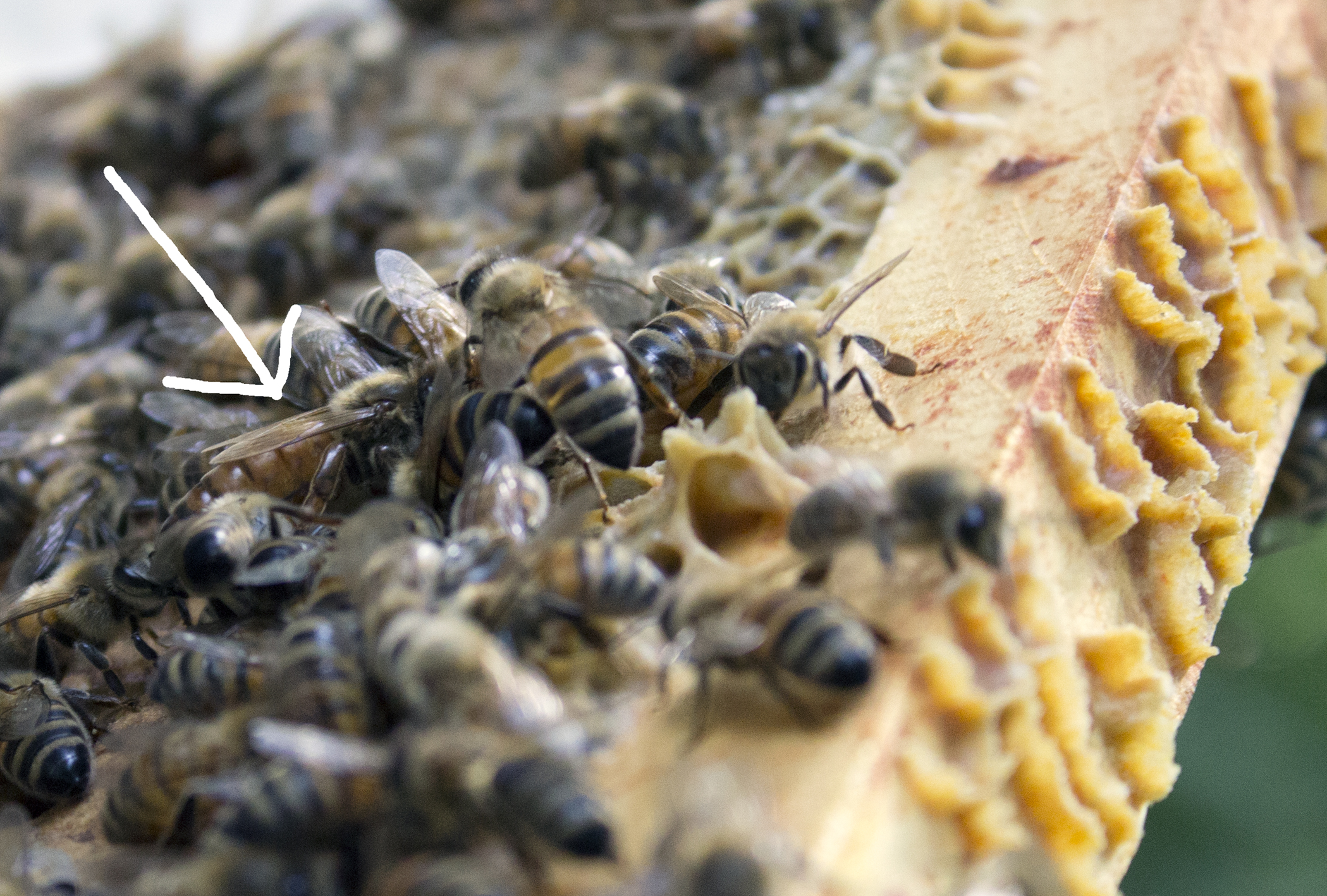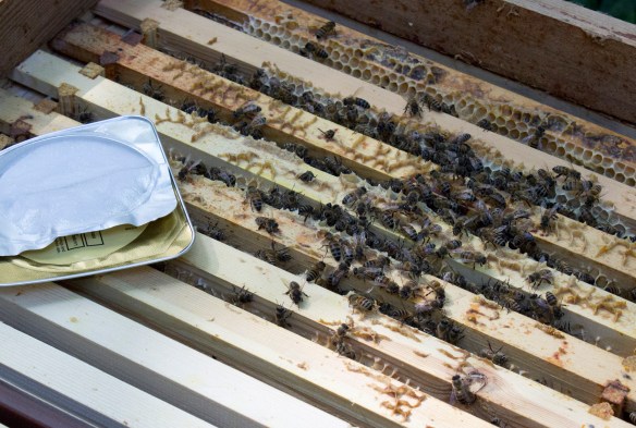 The worker bee spends her first two to three days eating pollen and cleaning cells, and sometimes sitting on brood to keep it warm. By day four she is sent to work in the food-processing factory and builds comb, turns nectar into honey and head butts pollen into cells.